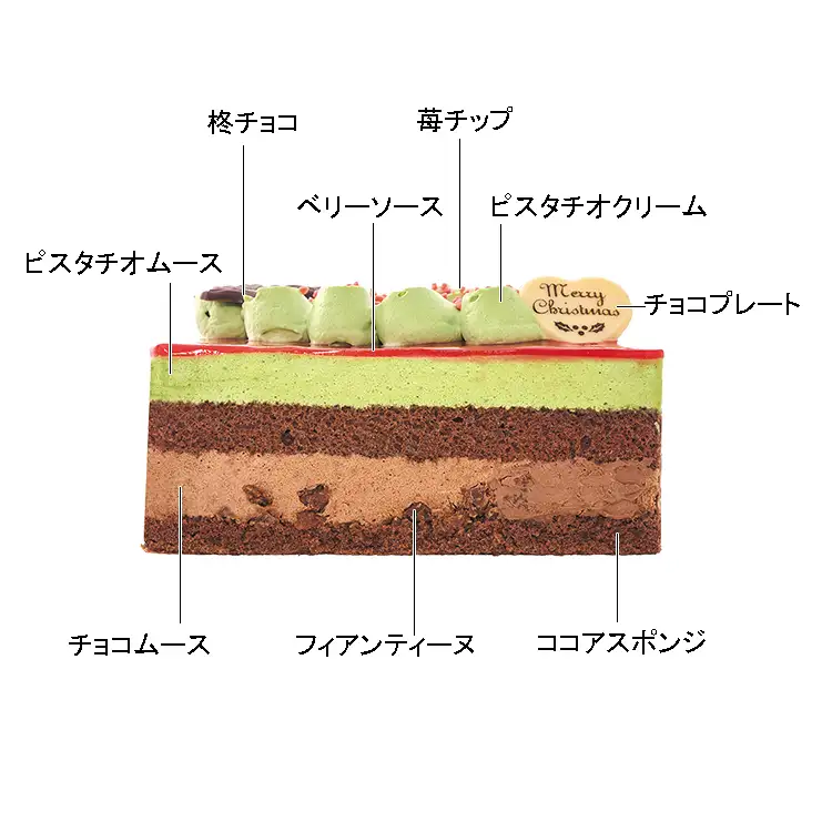 ピスタチオとチョコムースを重ね、甘酸っぱいベリーソースで仕上げました。サクサクのフィアンティーヌがアクセント。