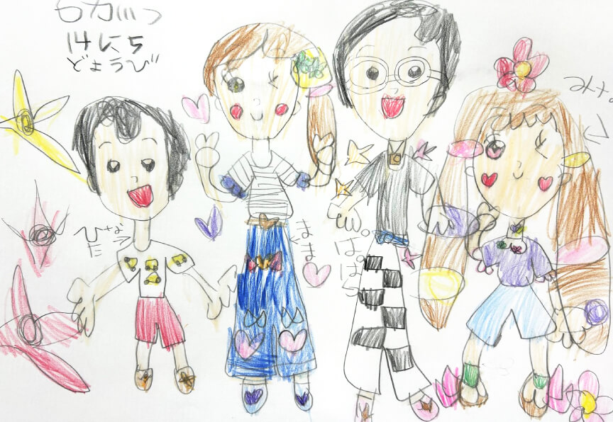 おじいちゃん、おばあちゃん、パパ、ママ、自分の絵を描いてくれました。みんなニコニコ笑っています。おばあちゃんとママはおしゃれをしてドレスを着ているそうです。