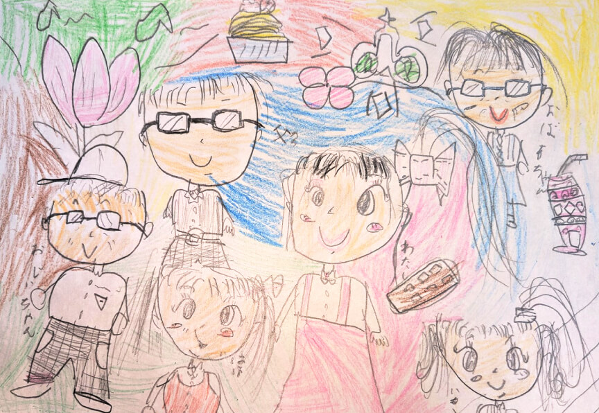 私、おじいちゃん、おばあちゃん、おとうさん、おかあさん、いもうと皆で、お菓子やお花がいっぱいある、知らない世界に行きたいと思いました。そして知らない世界で友達ができました。みんなではいチーズ! みんなでハッピー!