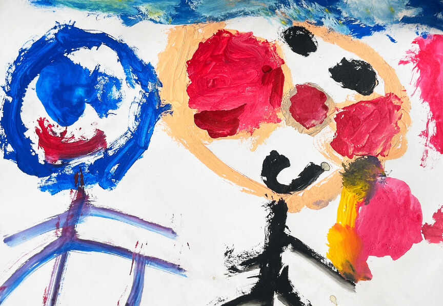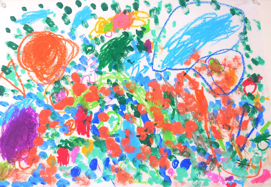 雨上がりの水玉で友達と遊んでいたら、「すってんころりん」して滑ったところと、園庭の桑の実を取って食べた事を描いたそうです。4歳児が見えている世界。