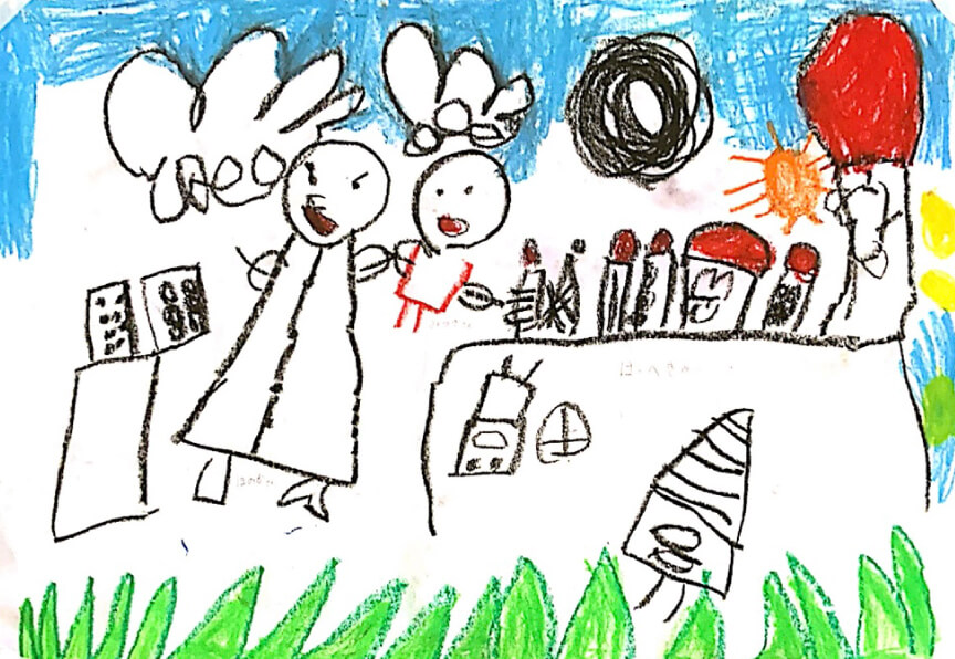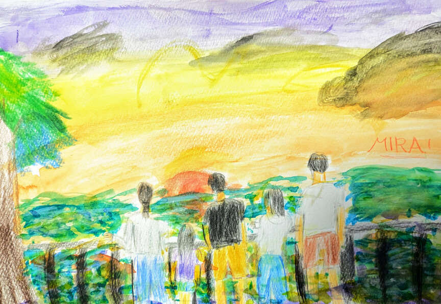 家族で野原にピクニックに行った絵です。虹が出てきれいでした。