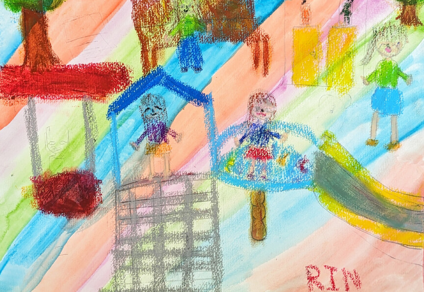 この絵は友達と公園で遊んだ時の絵です。背景は絵の具で虹をイメージして描きました。こだわりのポイントは、ブランコや滑り台、ベンチや人などを絵の具ではなく、クレヨンで描いたところです。