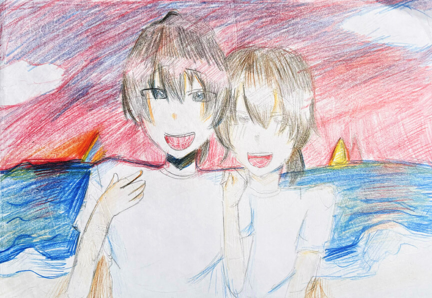 まず、わたしは家族で函館に行った時のキレイな夕日の海をイメージして描きました。こだわりのポイントは夕日のグラデーションです。水彩絵の具で描いたので、グラデーションがキレイになりました!