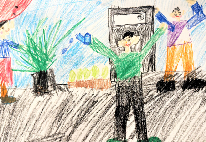 ぼくとおとうさんとおかあさんでおうちでそだてているサボテンとローズマリーにおみずをあげているえです。おかあさんはサボテンをさわっていたいよーといっていて、ぼくはうしろでおどっています。