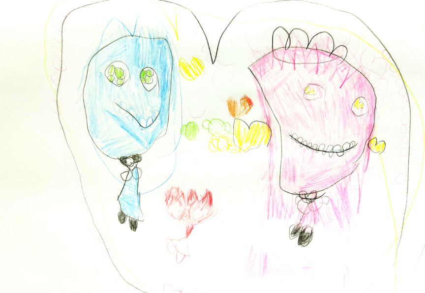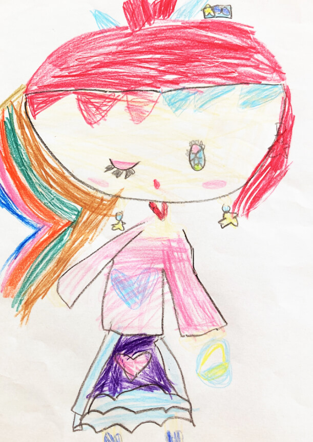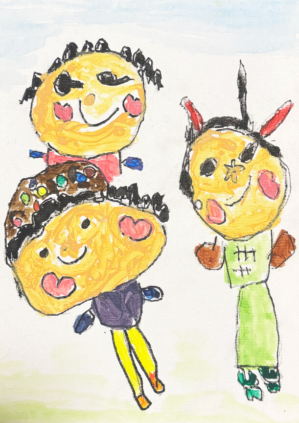 自分が産まれて喜んでいるパパとママを想像して絵を描いてくれました。うれしくて泣いている姿だそうです。服装は王子さまとお姫様をイメージしてくれたそうです(笑)