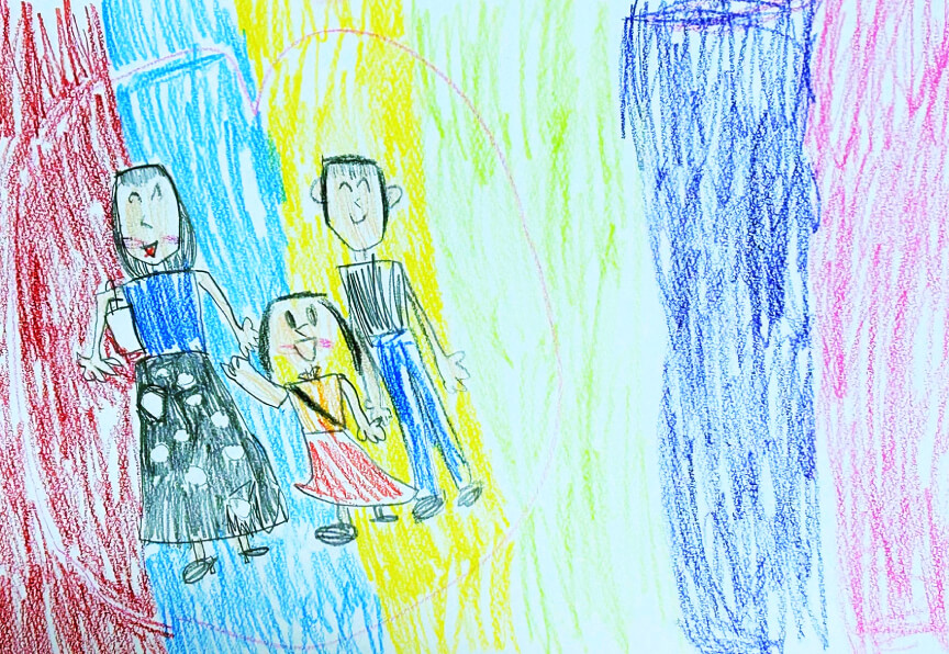 ピンクは優しさ、黄色は元気、黄緑は長生き、青は海のような心の広さを思い浮かべて、家族の絵をかきました。