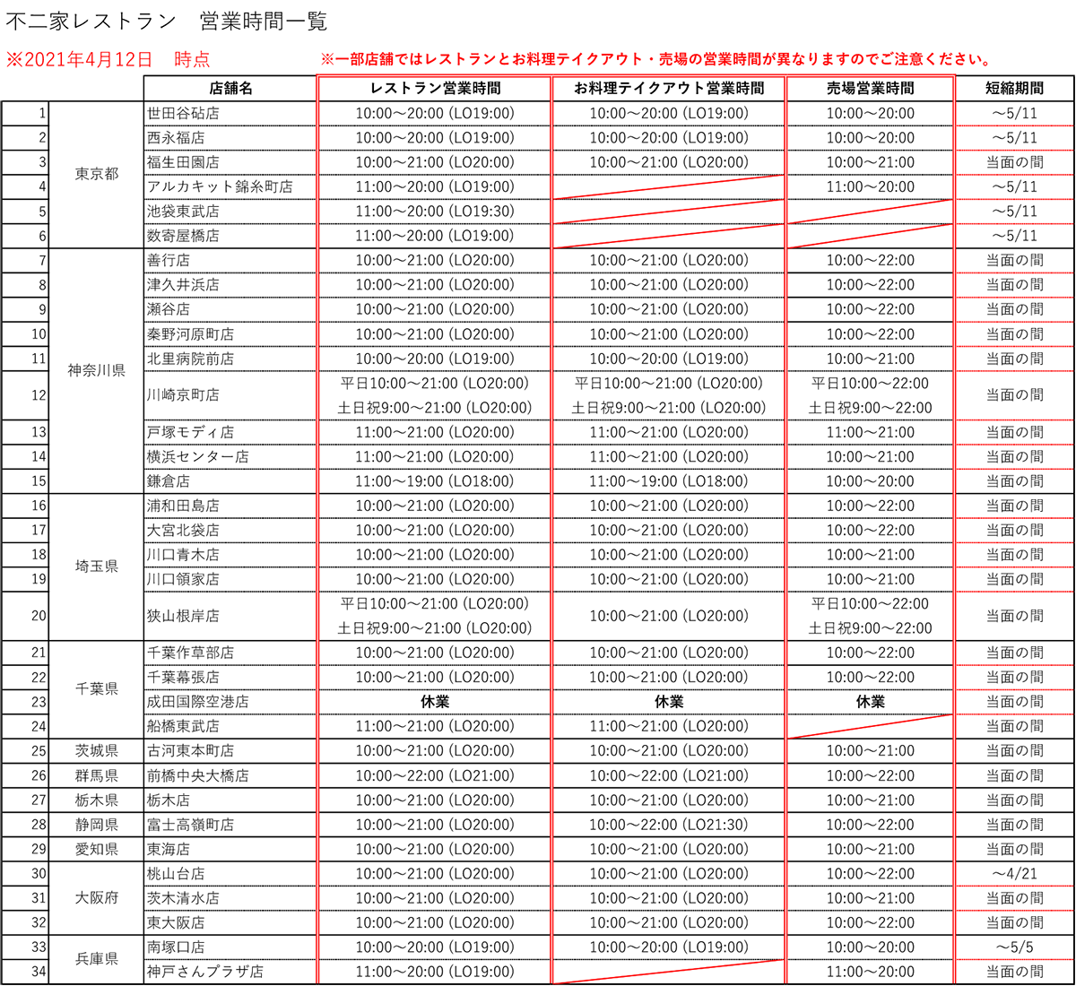 2021.04.09 不二家レストラン店舗休業・営業時間のお知らせ 東京都の営業時間短縮要請を受け、4/12(月)から一部店舗の営業時間を変更いたします。 詳しくは下記をご覧ください。 ※尚、状況により急遽休業になる場合もございます。 ※ケーキ食べ放題の実施時間やラストオーダーも変更となります。(予め各店舗にお問い合わせください。)